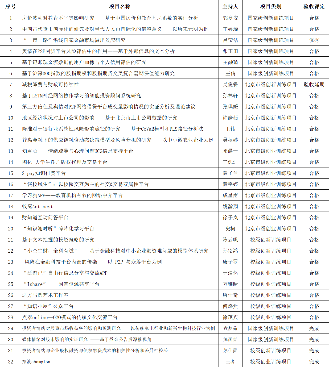 5月10日,根据教务处关于做好2019-2020学年第二学期大学生创新创业训练计划项目结项验收工作的通知,mg冰球突破试玩组织开展了本院大学生创新创业训练项目结项验收的网络答辩工作,经评委老师评审评定,现将验收结果公示如下: