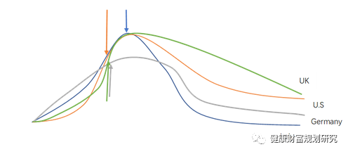 1. 疫情发展趋势。所有的传染病都是要经历过一个上升平台下降的过程,但用这个来说明疫情发展趋势过于粗糙,实际上因为以上三个因素的不同,其发展趋势各异,在我们测算的数据中,很少发现完全一样的形式,例如这里给出了模拟出来的过程,为了方便我添加箭头表示对应国家所处的阶段。这里特别需要说明的是德国的情况有些特殊,一个特殊是因为资源的充分性(ICU病床数量等,新冠肺炎所涉及到的资源从药品到ECMO大类平均17个,小类上百项目,我们这里是粗略估计了核心资源,比如没有ICU病床数其他的所有资源意义都不大),另外一个原因是其平衡之后的重症和普通症的治愈同步性,其形成了一个明显的速降状态。